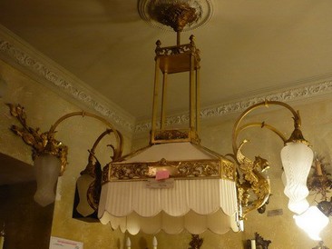 Бронзовая люстра с драконами и тканевым абажуром. Предмет интерьера на 7 лампочек. Италия, начало XX века.
