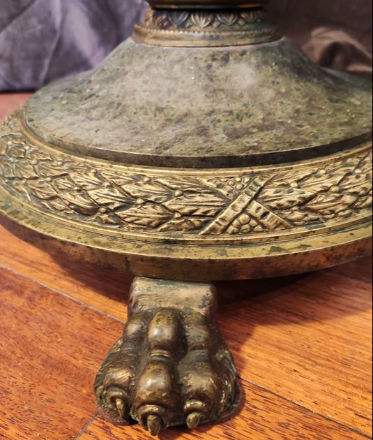 Светильник напольный из бронзы, декорирован мрамором. Абажур выполнен из шёлка. На три светоточки, одна из которых направлена вверх. Два выключателя. Стиль - ампир. Начало ХХ века. Италия
