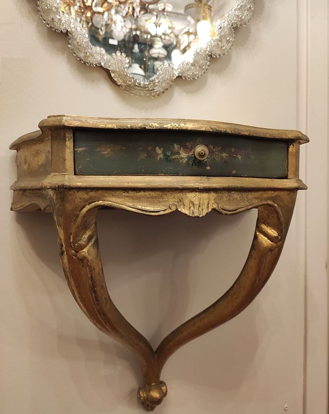 Старинная деревянная консоль с выдвижным ящиком с ручной росписью. Начало 20-го века. Италия