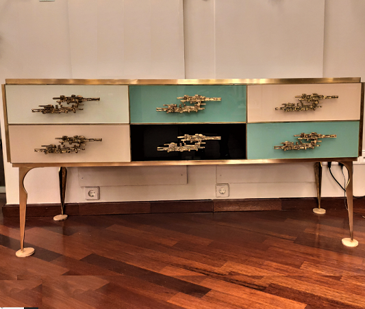 Винтажный комод с шестью выдвижными ящиками бирюзового, чёрного и светло-бежевого цветов, с латунными декоративными элементами. 50-е годы ХХ века. Италия